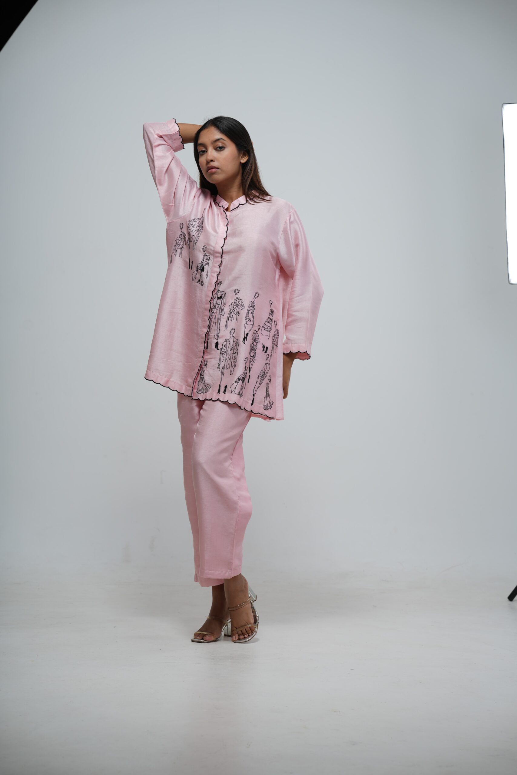Radiate timeless charm with Kaaru’s Baby Pink Bemberg Silk Co-ord Set, a contemporary blend of sophistication and creativity. Made from premium Bemberg silk, this set offers a subtle sheen and fluid drape, ensuring effortless comfort and style. The top features intricate black thread embroidery of artistic fashion figures, contrasted beautifully against the soft pink base.
