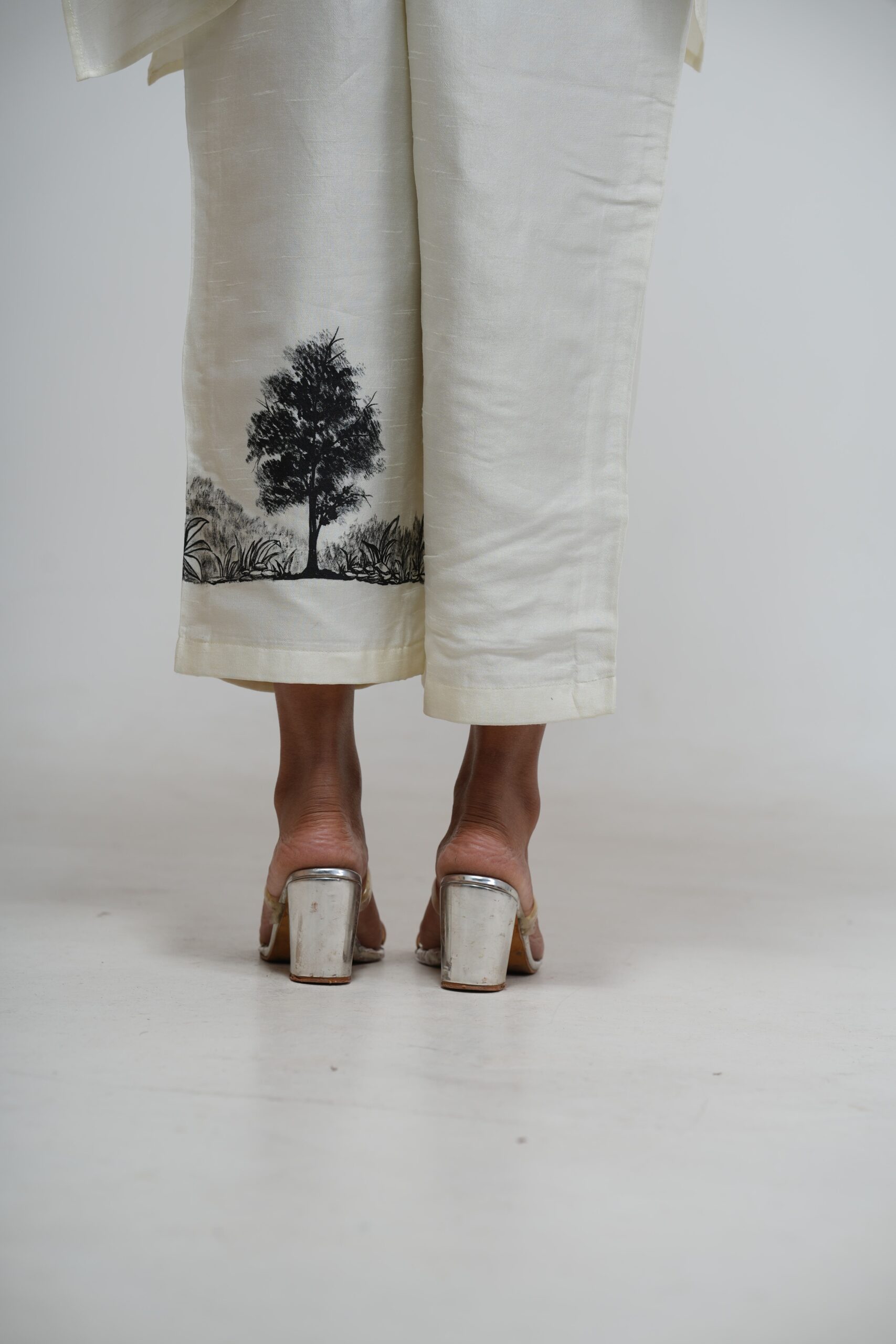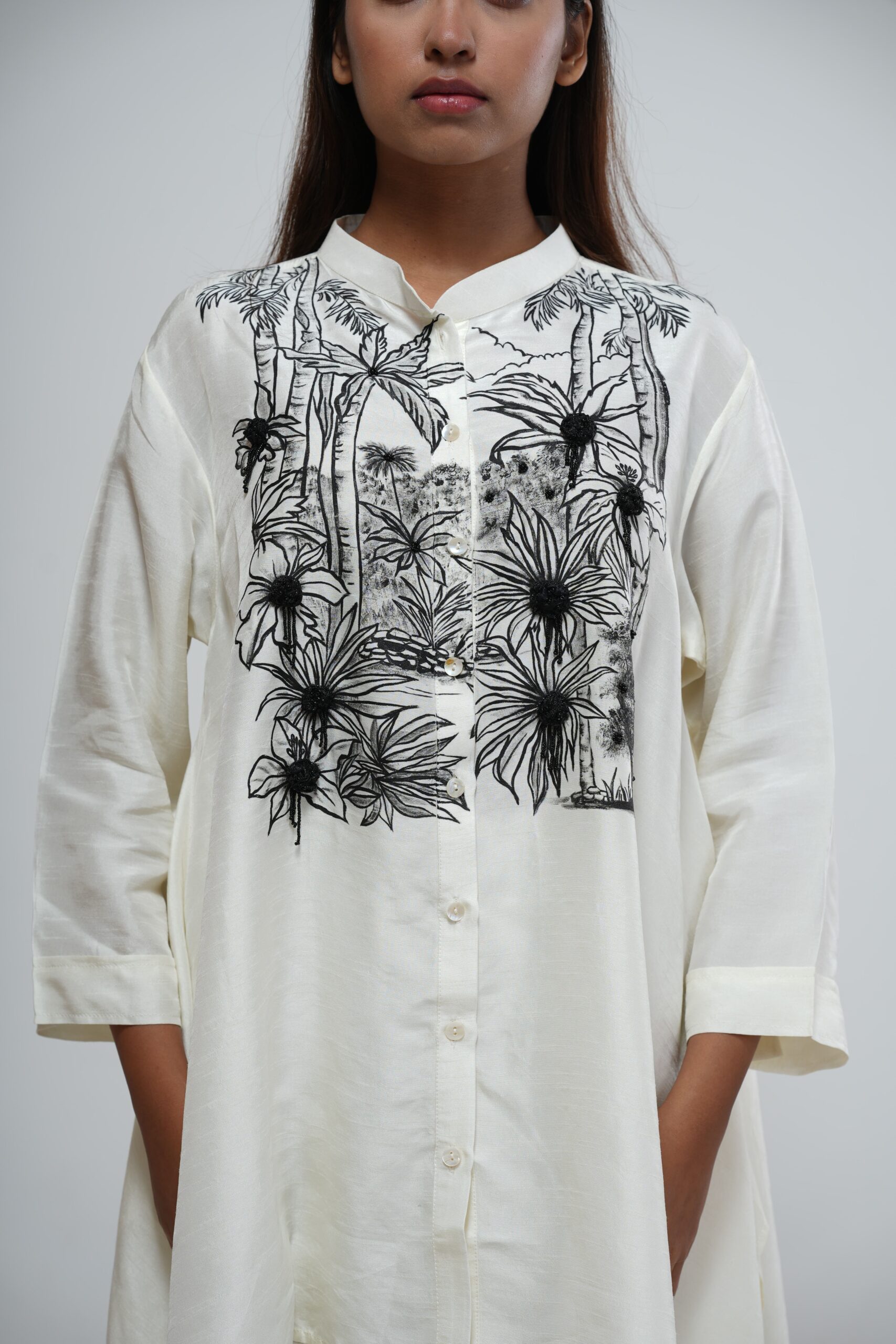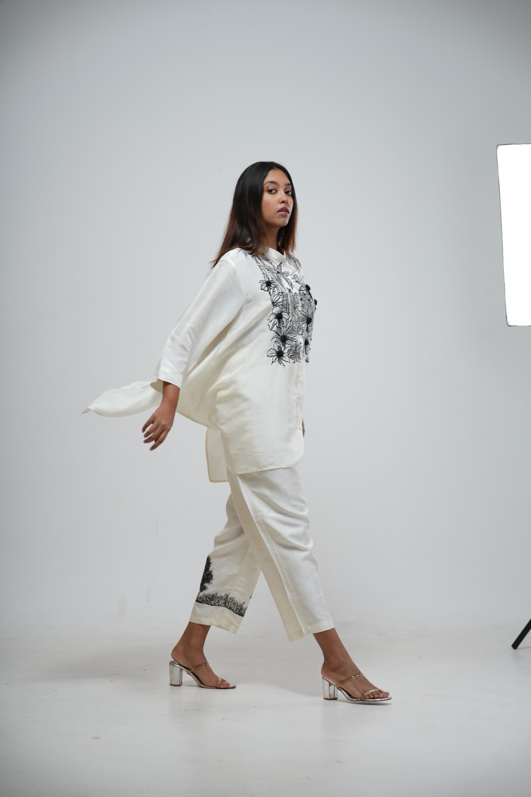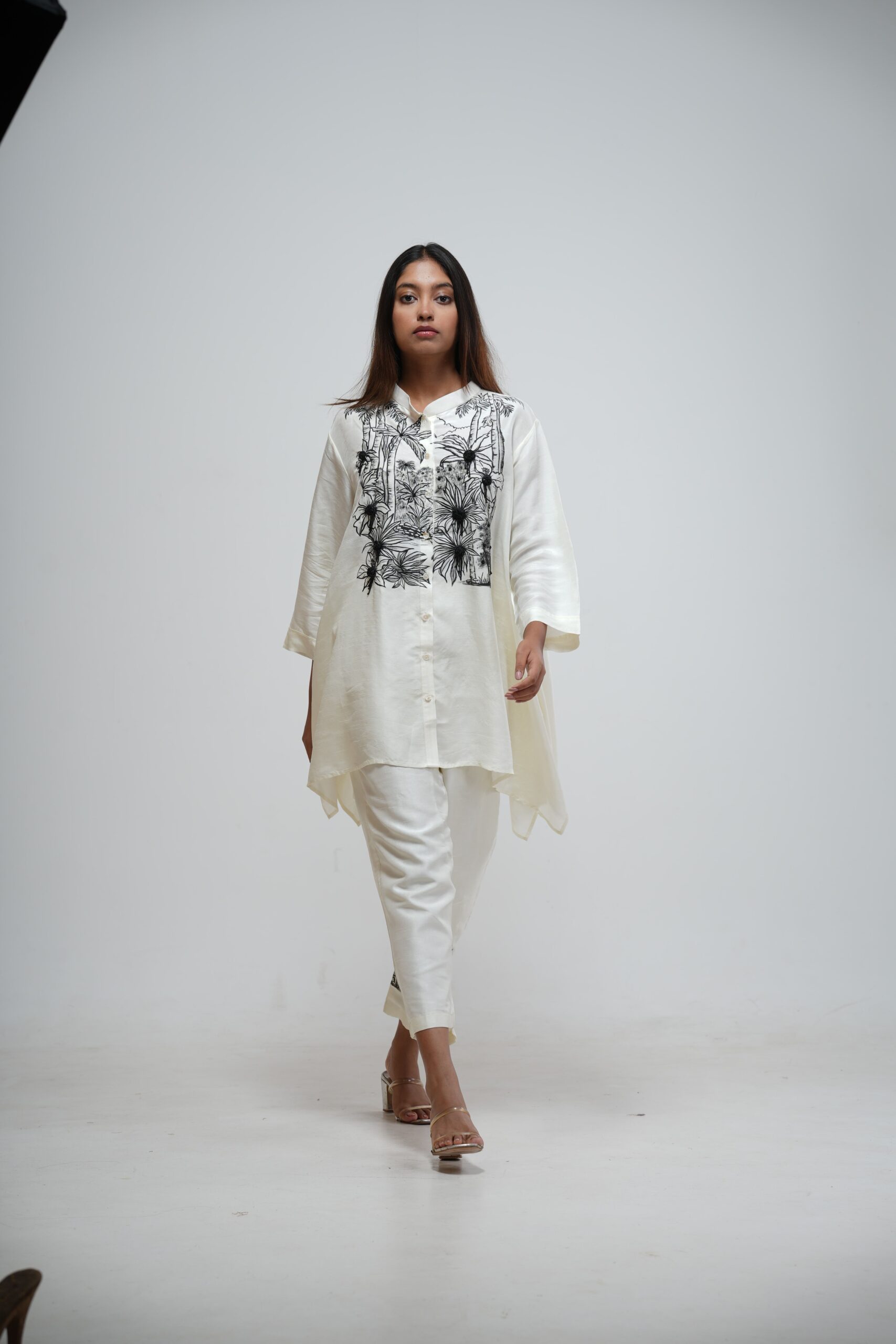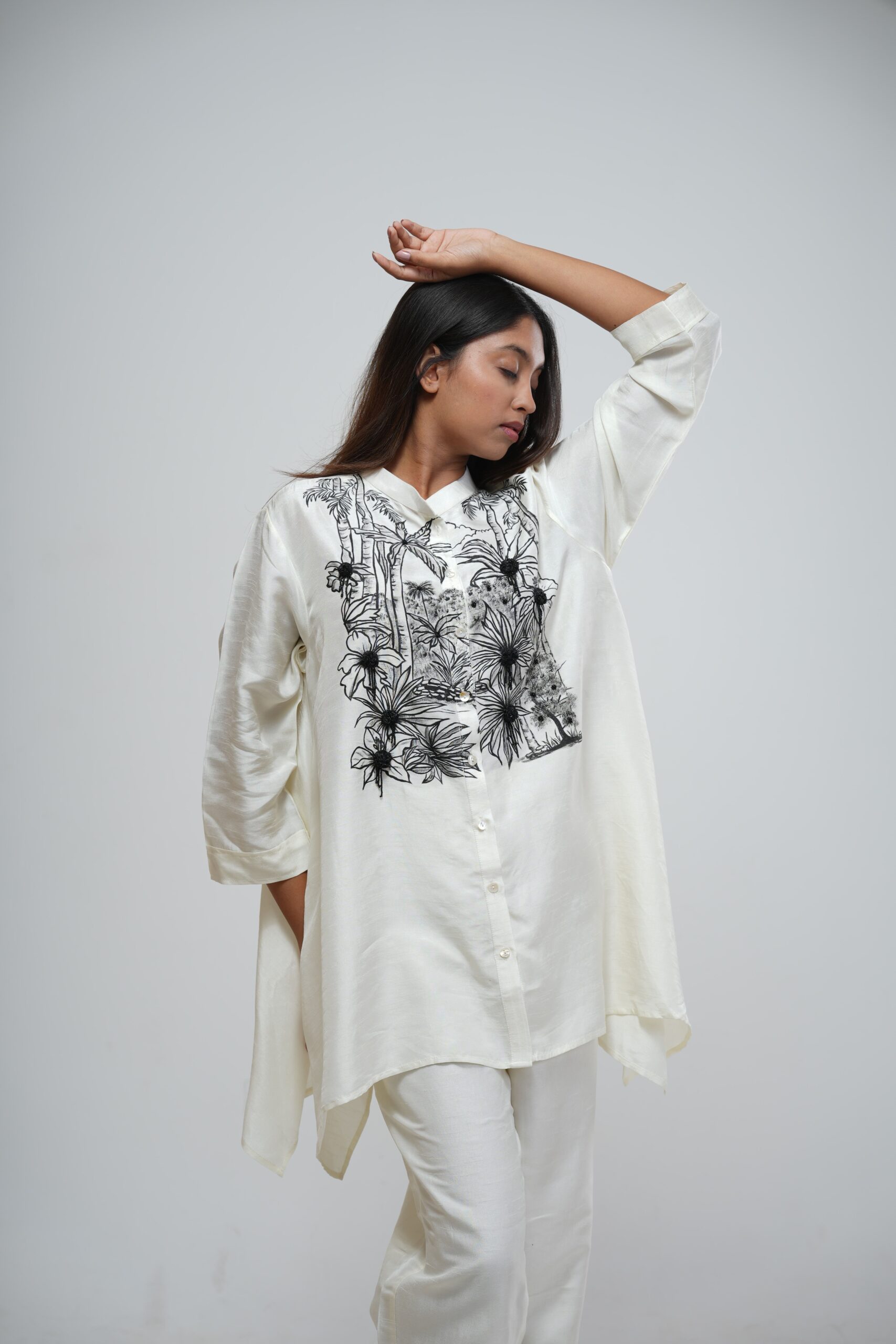 Achieve sophisticated monochrome elegance with the Ivory Asymmetric Tunic Set. This flowing tunic features a dramatic high-low hem and is defined by exquisite black botanical hand-embroidery across the chest. Paired with comfortable, matching ivory trousers, this set is a chic and versatile addition to any wardrobe.