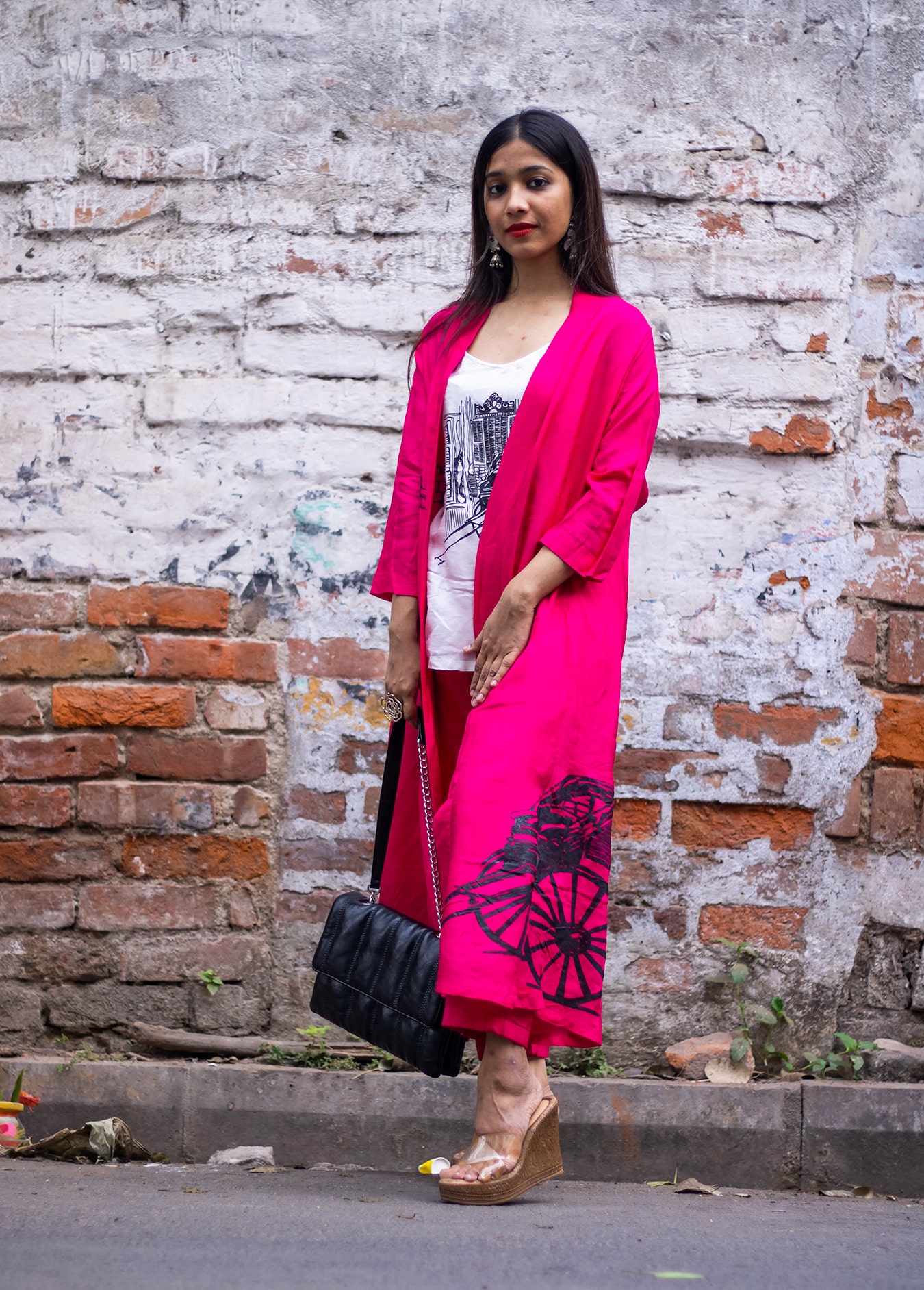Make a statement with this vibrant Fuchsia Pink Longline Shrug Set. The flowing pink jacket features a bold black graphic detail at the hem and is layered over a soft white Architectural Print Tank Top. Paired with matching pink bottoms, this set is a perfect blend of artistic flair and contemporary style.
