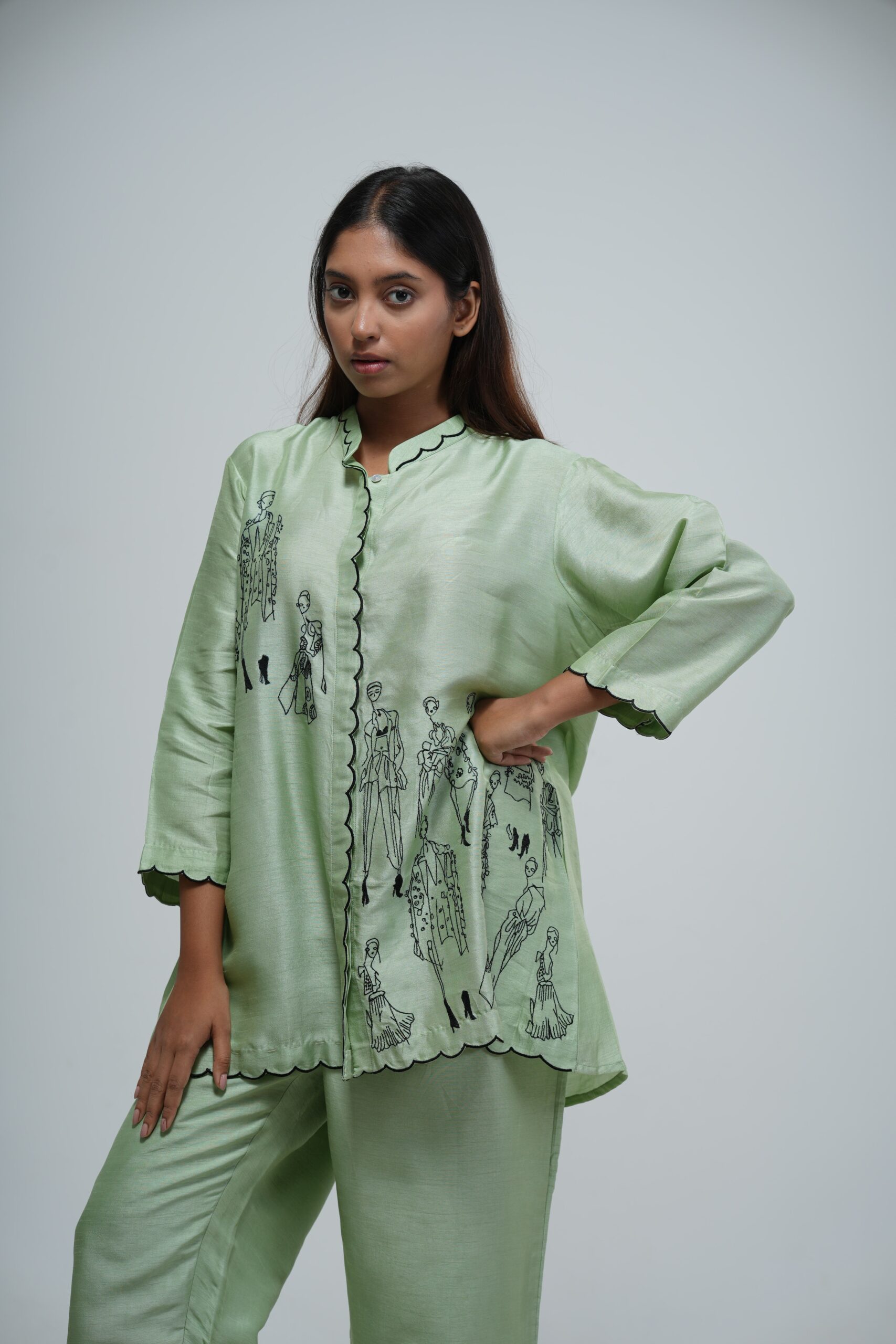 A chic pista green co-ord set in silk blend fabric, detailed with hand-drawn fashion figure embroidery and scalloped edges, where artistry meets comfort.
