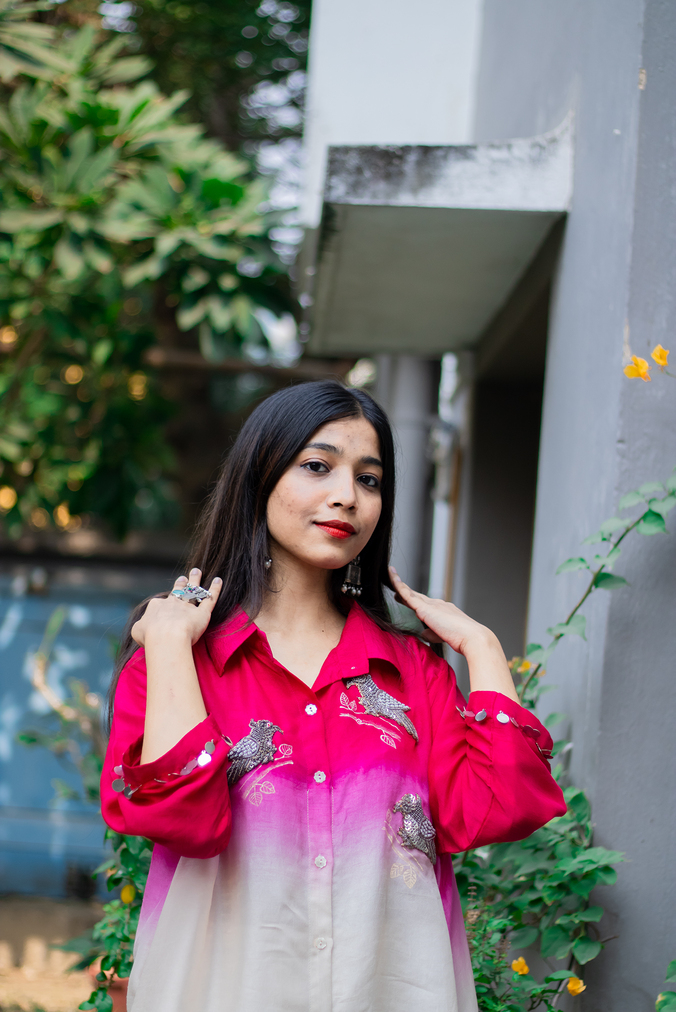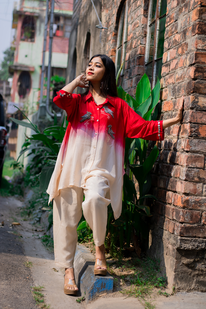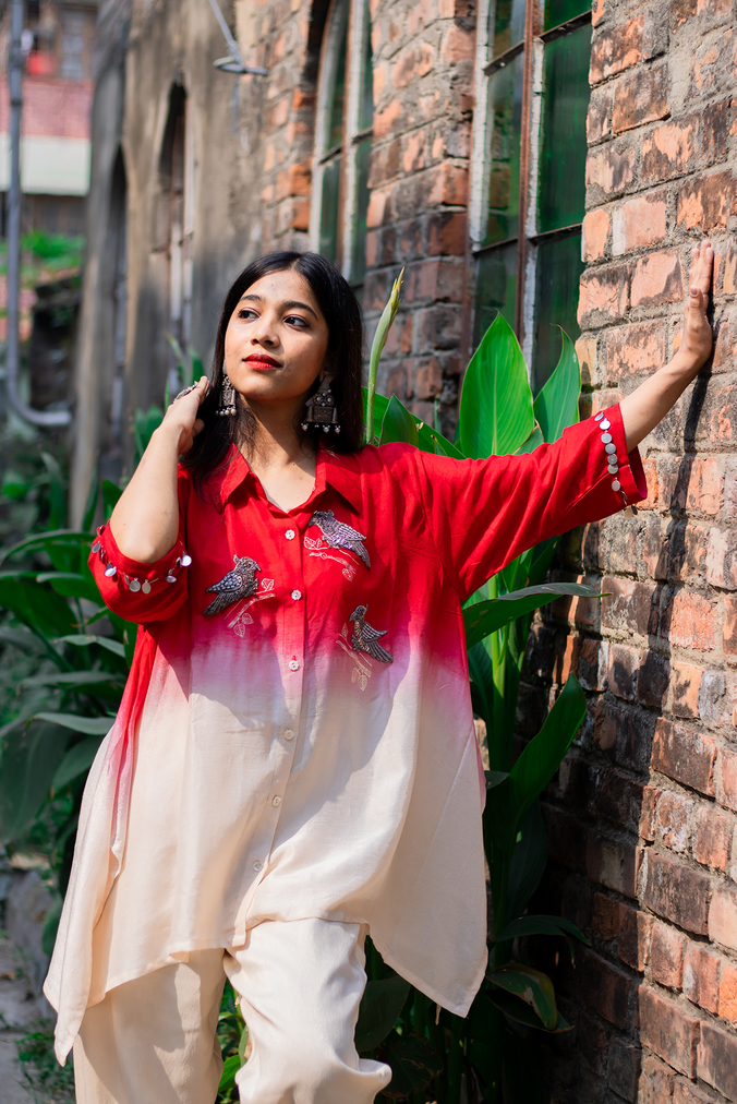 A stunning ombre kaftan-style kurta in red and ivory with delicate bird embroidery, paired with comfortable pants. Perfect for festive celebrations, casual gatherings, or statement daywear.